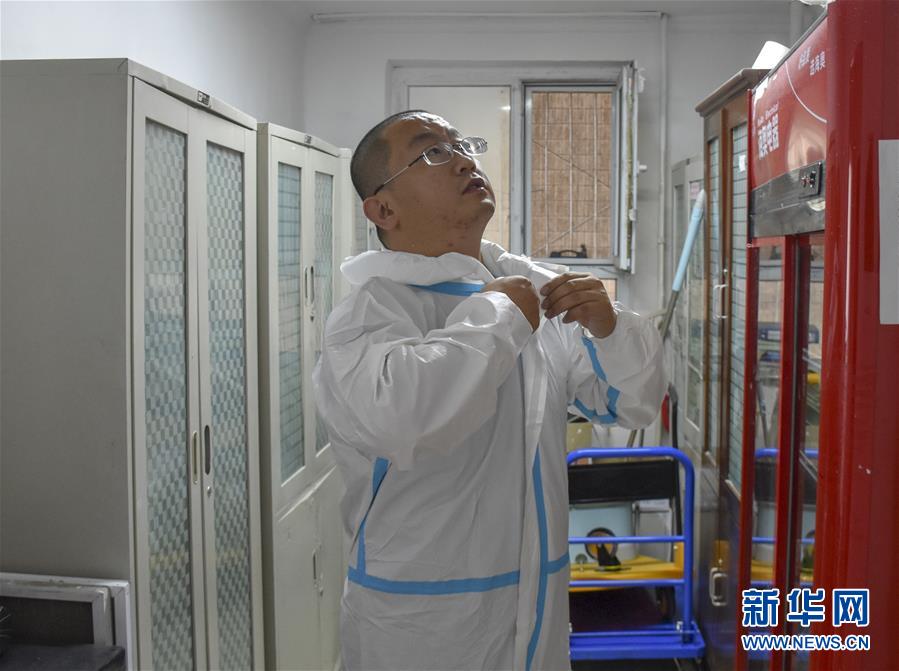 8月12日,烏魯木齊市天山區山西巷社區工作人員王志鷹在穿防護服。新華社記者 高晗 攝
