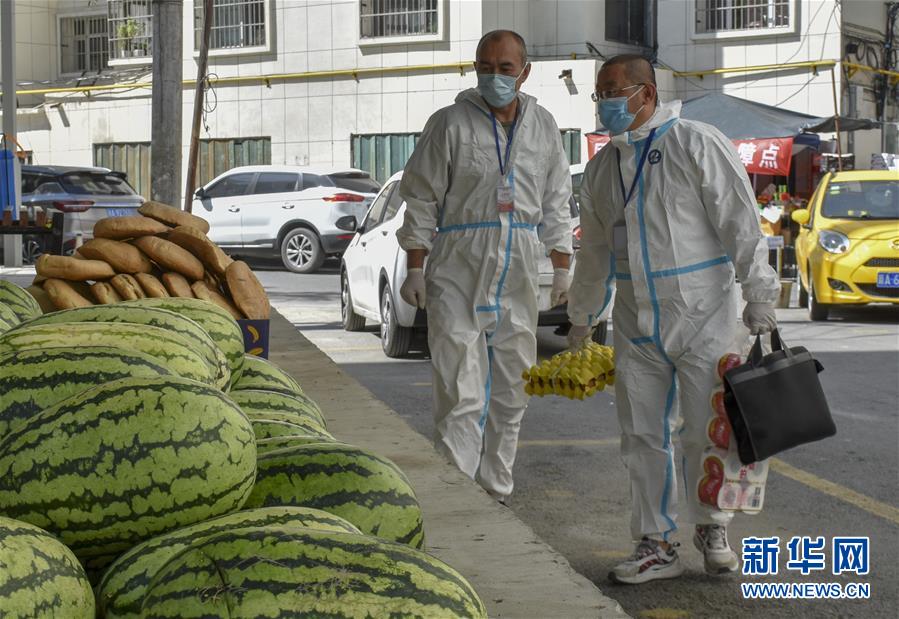 8月12日,烏魯木齊市天山區山西巷社區工作人員王志鷹(右)在社區物資保障點前詢問水果銷售情況。新華社記者 高晗攝