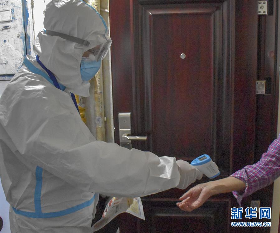 8月12日,烏魯木齊市天山區山西巷社區工作人員王志鷹(左)上門為居家居民測量體溫。新華社記者 高晗