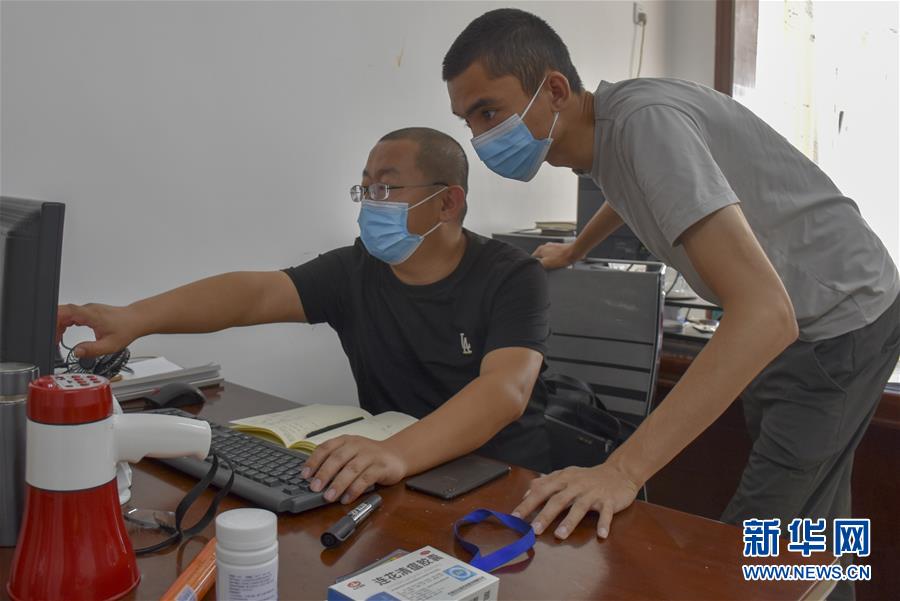 8月12日,烏魯木齊市天山區山西巷社區工作人員王志鷹(左)與同事溝通工作事宜。新華社記者 高晗 攝
