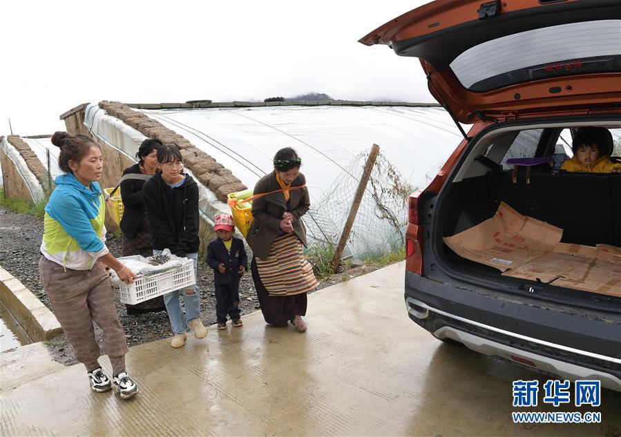 格桑旺姆(左三)和姐姐德吉卓瑪(左一)帶領雇傭的殘障村民巴珍(右一)搬運大棚出產的新鮮蔬菜(8月3日攝)。新華社記者 李賀 攝