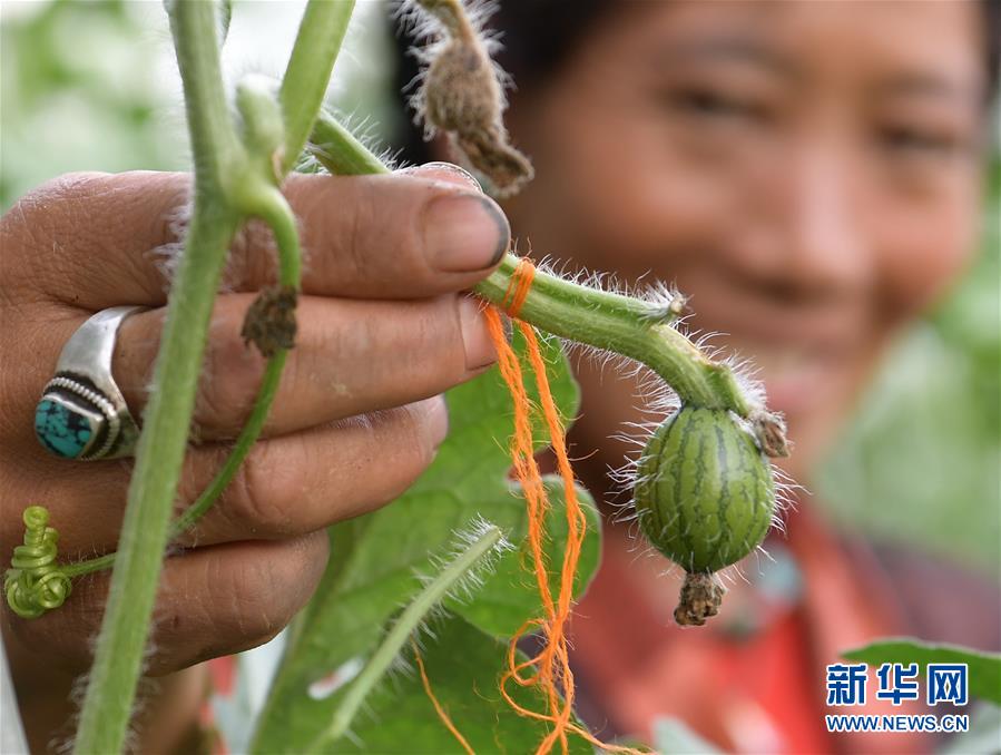 格桑旺姆姐妹家大棚內的瓜秧上結出的小西瓜(8月2日攝)。新華社記者 李賀 攝