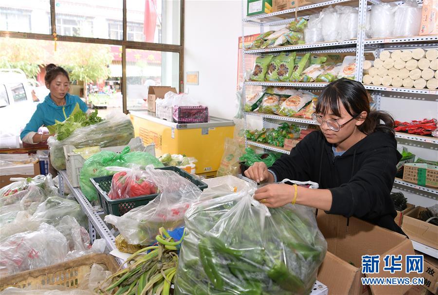 格桑旺姆(右)和姐姐德吉卓瑪在位于白朗縣的蔬菜店內忙碌(8月3日攝)。新華社記者 李賀 攝