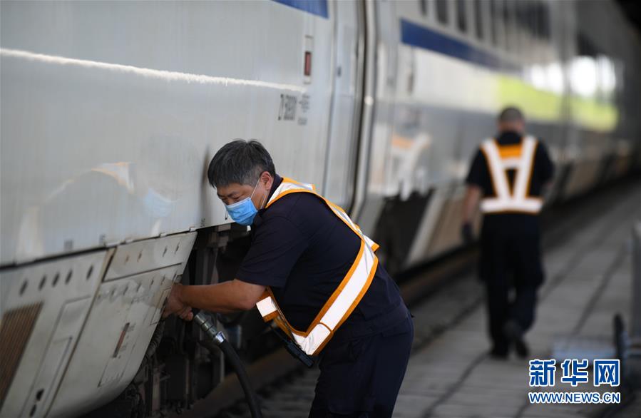 8月12日,長春火車站客運車間上水工王軍在給列車上水。進入暑運高峰,為了保障列車正常用水,每當一列火車停靠車站,長春火車站的上水工就冒著酷暑將水管插進火車底部的輸水口,快速準確完成輸水作業。新華社記者 林宏 攝