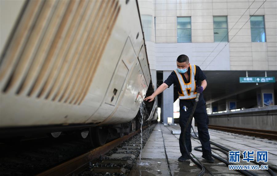8月12日,長春火車站客運車間上水工龔關在給列車上水。新華社記者 林宏 攝