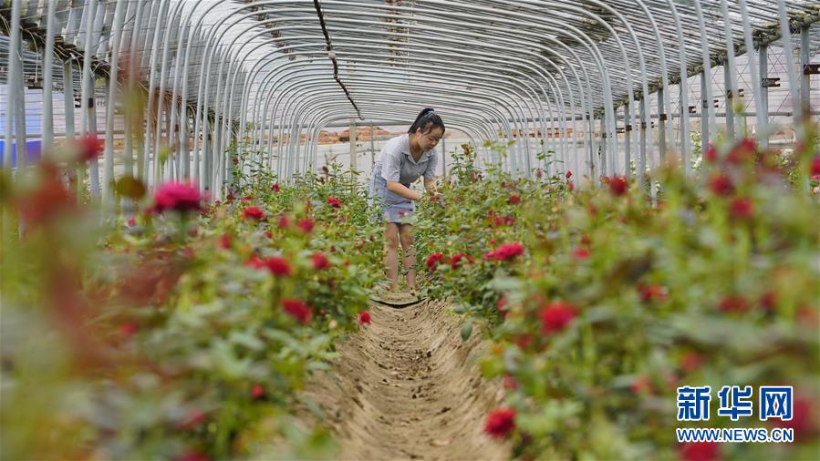 8月12日,河北省灤州市茨榆坨鎮謝各莊村花農在查看玫瑰長勢。新華社記者 牟宇 攝