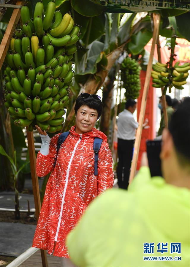 在吉林省永吉縣萬昌鎮宇豐紅果木瓜產業園,游客與大棚內的香蕉合影留念(8月12日攝)。新華社記者 許暢 攝