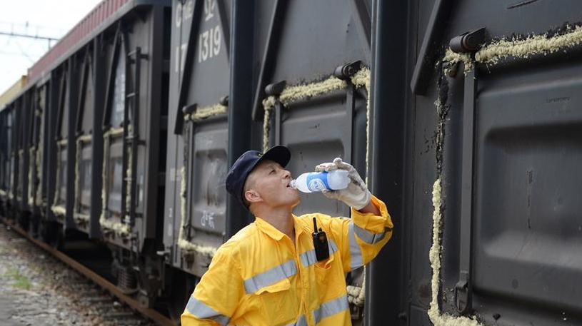 進入暑運高峰,為了保障列車正常用水,每當一列火車停靠車站,長春火車站的上水工就冒著酷暑將水管插進火車底部的輸水口,快速準確完成輸水作業。