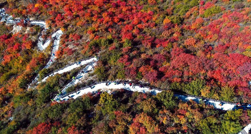 金秋十月,河北省涉縣偏城鎮太行紅葉大峽谷的紅葉進入觀賞佳期,吸引眾多游客前來登山賞景。