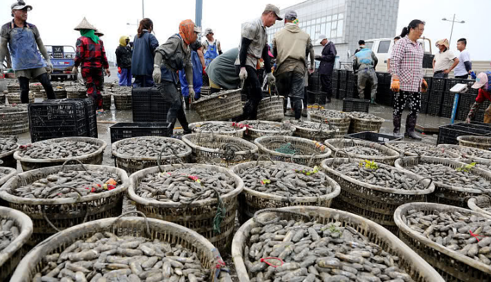 2019年7月9日,漁民們在江蘇連云港沿海地區海邊的灘涂上將剛收獲的海蟶運送上岸裝箱外運。
