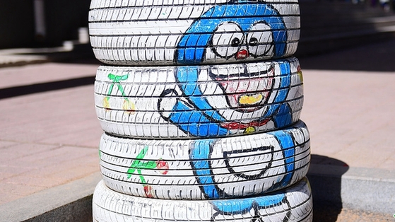 5月4日,二十余個印有卡通圖案及奧運五環造型等創意輪胎花盆亮相沈陽,吸引市民。多啦A夢卡通輪胎