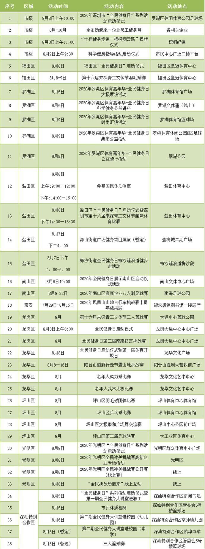 在啟動當日,全市各區也同步聯動,啟動了“全民健身日”系列活動。即日起至8月10日,深圳將陸續推出近40項全民健身運動系列活動,內容涵蓋來深青工文體節、企業員工健身月、體育嘉年華系列展演、全民沖關線上挑戰賽、足球、籃球、老年太極、柔力球、國民體質測定、全民健身大講堂、健身步道健步行等。此外,全市各公益體育館也將面向市民免費開放,大家可關注各場館進行預約。
