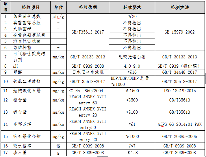 2. 甲醛含量參考日本衛生巾及直接接觸皮膚相關產品法規中≤16mg/kg的要求,該指標要求高于GB/T35613-2017《綠色產品評價 紙和紙制品》標準中甲醛含量≤75mg/kg的要求。 3.針對消費者高度關注的衛生巾具有熒光增白劑問題,在本次比較試驗中考核“可遷移性熒光物質”要求為:不得檢出。