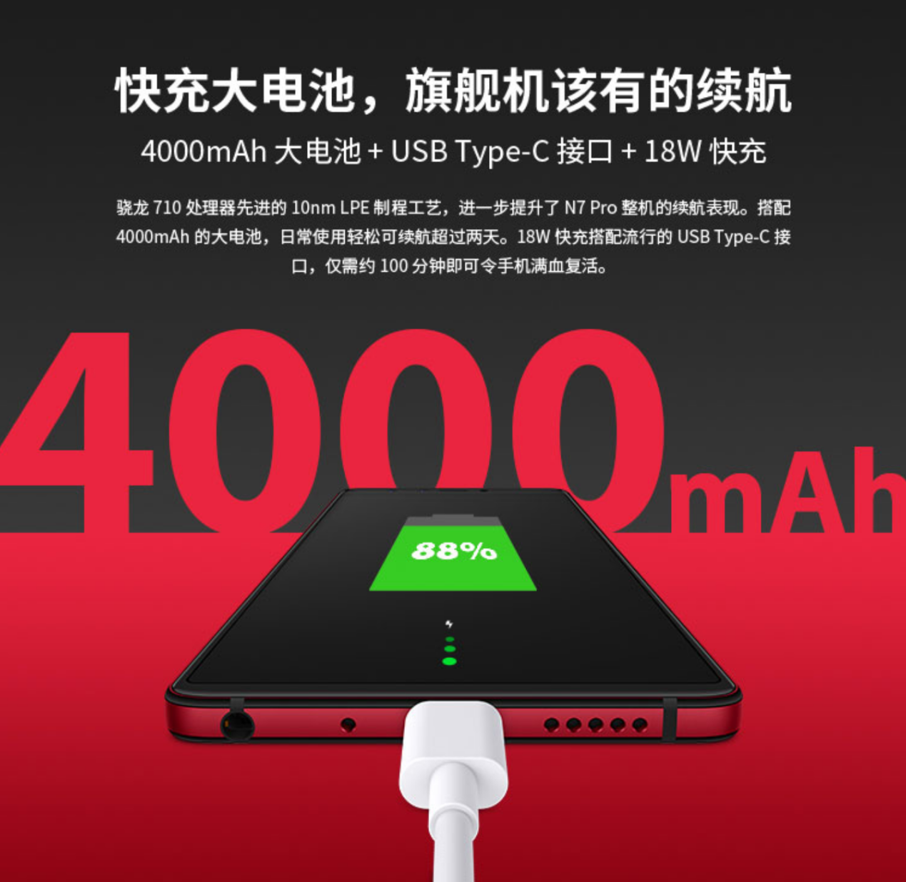 360手機N7 Pro采用了雙面玻璃機身設計,無劉海5.99英寸全面屏,分辨率2160×1080像素,有珊瑚紅和瑪瑙黑兩色可選。作為2018年度的旗艦機型,配置上,N7 Pro搭載當前高通家族中最受關注的驍龍710處理器,4000mAh大容量電池,支持18W快充,官方宣稱20分鐘可充電30%,100分鐘可充滿。此外在拍照方面,360手機N7 Pro采用了堪稱耀眼的四攝設計。