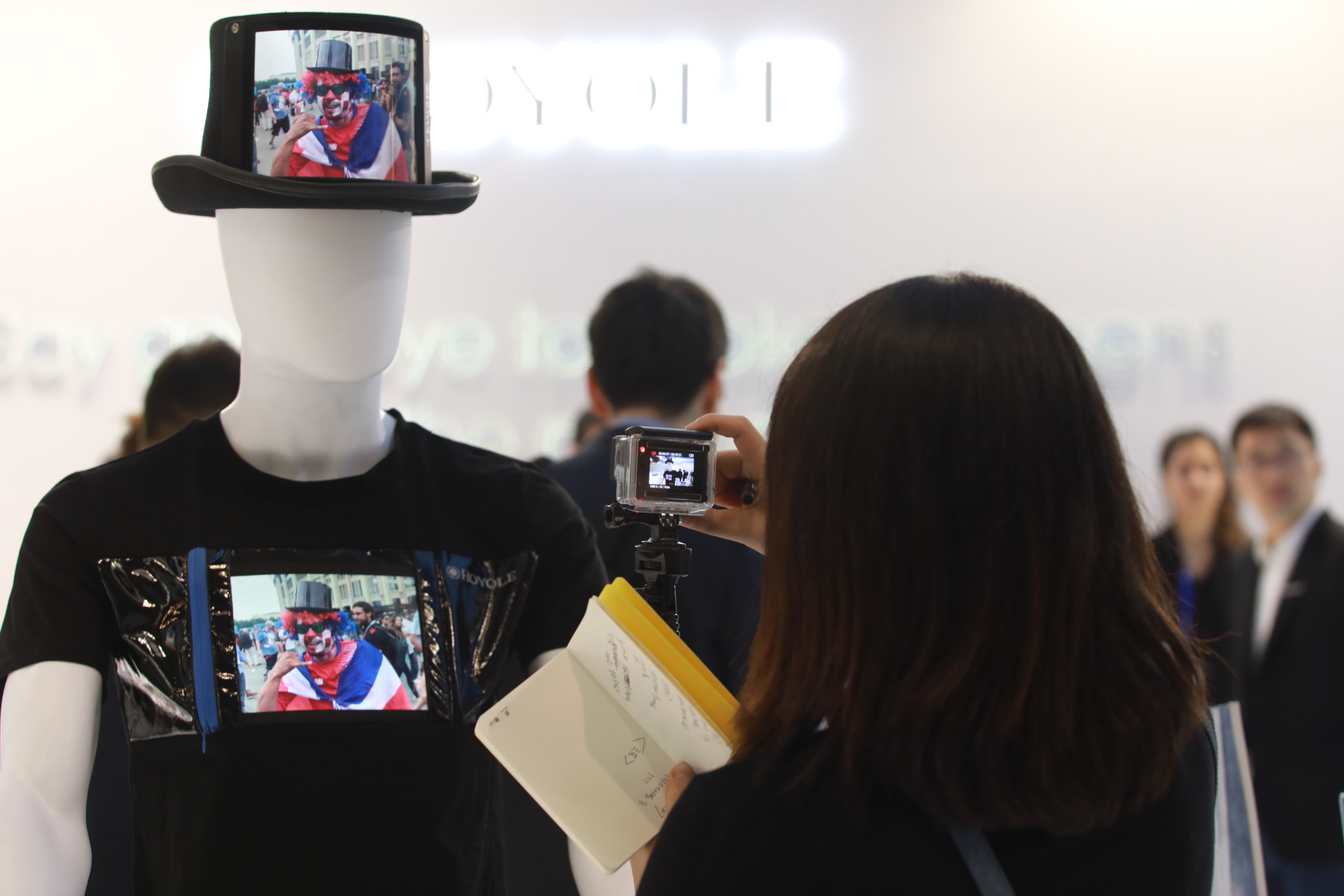 法國(guó)一女士體驗(yàn)高清柔性屏?xí)r尚衣帽后對(duì)柔宇工作人員說(shuō):"柔性屏?xí)r尚衣帽套裝超酷,這個(gè)如果能穿去派對(duì)的話(huà)就太完美了。"