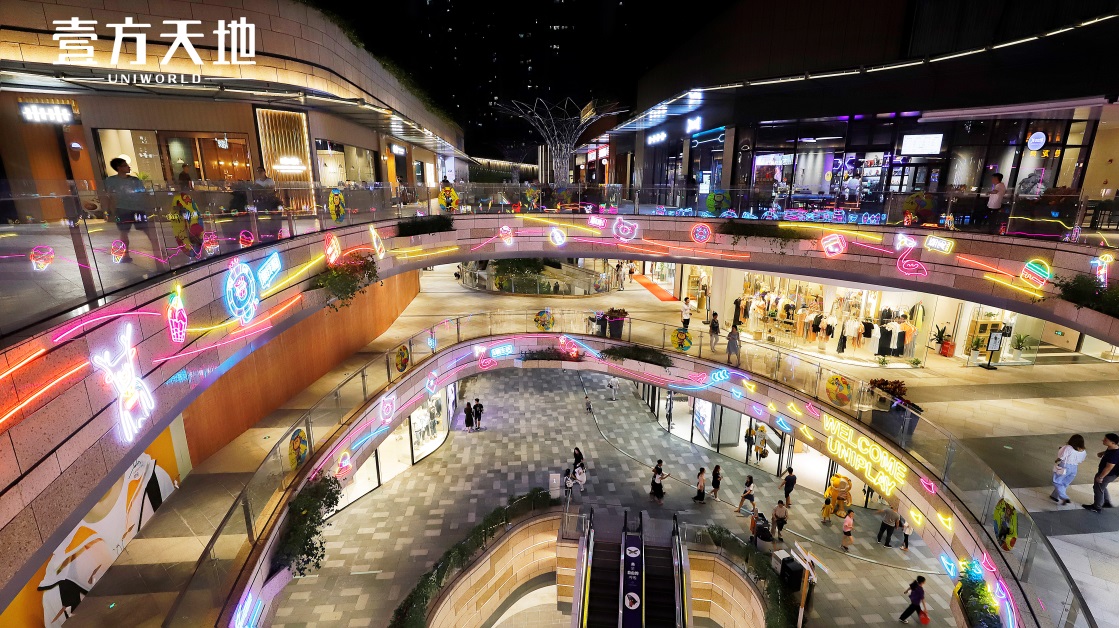 “顏值是第一生產(chǎn)力”,要打造夜間標(biāo)桿,氛圍營造必不可少。壹方天地將燈飾與建筑、綠植等多個元素巧妙結(jié)合,璀璨的景觀燈、夢幻的星星燈、妙趣橫生的IP主題霓虹燈烘托出獨具一格的藝術(shù)氛圍。夜晚時分搭配噴泉秀和噴霧,光影夢幻,玉壺光轉(zhuǎn),營造出極富層次感的夜景。同時,通過加強外圍的燈光照明等,持續(xù)亮化夜間氛圍,壹方天地成為夜間休閑、聚會的絕佳場所。“消費者沒事也喜歡來走一走,享受工作之余的休閑時光。”潘燦峰說道。
