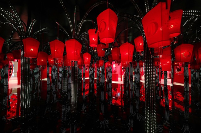 蘭蔻新春游園會燈籠滿園,熱鬧非凡。中央環屏播放著每一份美好祝福,為每一位參觀者獻上最暖心的祝愿。參觀者可通過電子互動屏留下自己的祝福,隨后這份祝福將會呈現在中央環屏上。參觀者可駐足片刻,合影留戀。