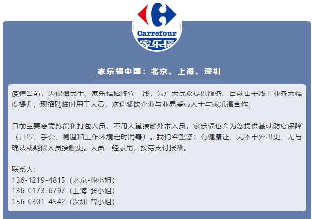 此外,家樂福還向全社會發(fā)出召集,以北京、上海、深圳為重點(diǎn)城市,希望社會暫時(shí)性歇業(yè)人員能夠前來上崗,主要工作職責(zé)為線上業(yè)務(wù)的揀貨、打包,不用大量接觸外來人員。家樂福將提供快速上崗培訓(xùn),包括個(gè)人安全衛(wèi)生和防護(hù)、顧客服務(wù)和崗位技能培訓(xùn),以及基礎(chǔ)防疫保障。