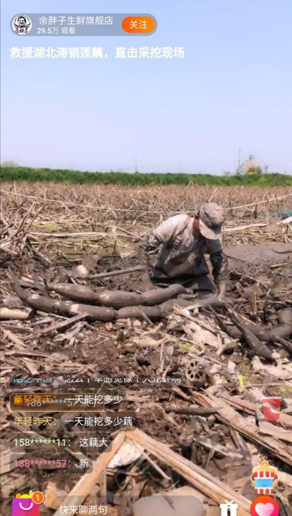 除了湖北的縣長(zhǎng)、市長(zhǎng)外,普通的湖北商戶不甘落后。8日上午,荊州洪湖的陽(yáng)光明媚,“余胖子生鮮旗艦店”的店主便打開(kāi)手機(jī)接通了直播,樸實(shí)的農(nóng)民性格讓他面對(duì)鏡頭一時(shí)不知該說(shuō)什么好,簡(jiǎn)單問(wèn)好后,他就轉(zhuǎn)身下了塘,開(kāi)始從厚重的泥土里拔出一根根新鮮的蓮藕。有不少00后網(wǎng)友是第一次見(jiàn)到挖藕的過(guò)程,他們發(fā)現(xiàn)原來(lái)潔白爽口的大藕居然是從泥中挖出來(lái)的,“挖藕真的太不容易了,一個(gè)上午要泡在塘泥里。”