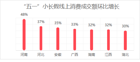“五一”小長假尤其對河南、河北、安徽等中部省份的線上消費(fèi)拉動作用更強(qiáng)。由于一線城市的線上消費(fèi)趨于日常化,人們多外出活動,用親近大自然、戶外活動的方式度過假日。同時,一部分在大城市里工作的人員也在假日返回老家,帶動了中部省份的線上消費(fèi)。