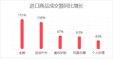 隨著人們生活水平的提升,進(jìn)口生鮮成交額同比增長了151%。近幾年,進(jìn)口生鮮的價格門檻下降,尤其是進(jìn)口的奶制品、豬肉、牛肉的價格跟國產(chǎn)商品十分接近。此外,借助于品牌優(yōu)勢,進(jìn)口的運(yùn)動戶外、美妝護(hù)膚、玩具樂器、個人護(hù)理等商品的成交額同比增長也比較高。