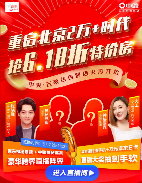 值得關注的是,中國內地男演員張曉謙、奇葩說選手大王、以及京東和中駿的兩位“神秘嘉賓”還將在5月22日上午11點帶來直播,在線預售全新房源,并將一套6.18折的特價房開展618抽獎活動,優惠后僅需一百多萬元即可拿下一套北京新房。