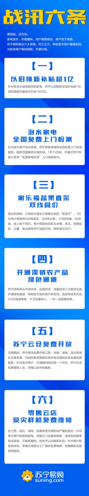 在江西、湖北、湖南、安徽等受汛情影響嚴重的省份,針對受災用戶的受損家電,零售云門店也將提供維修、清洗和消毒,不能修復的,則給予以舊換新補貼。