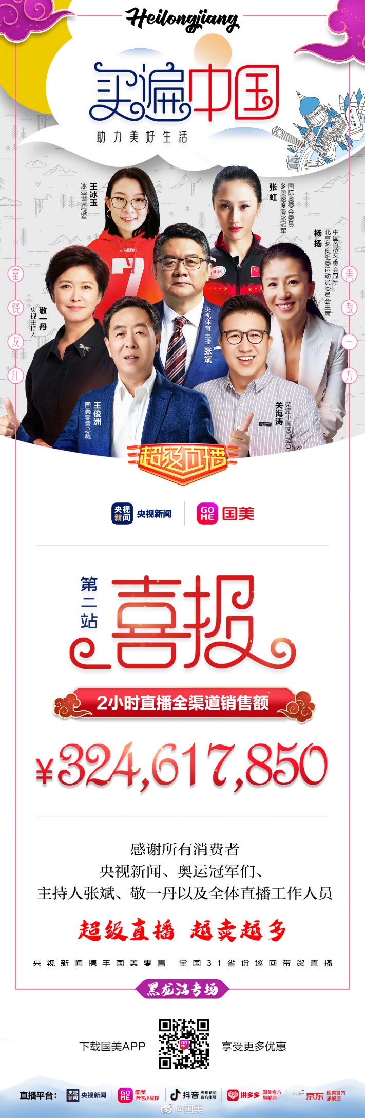 見圳客戶端·深圳新聞網2020年8月4日訊 群星閃耀,再創佳績!7月31日晚20點,“買遍中國·助力美好生活”全國31省份巡回帶貨直播黑龍江專場以3.25億的銷售額收官。出生于黑龍江的中央電視臺著名主持人敬一丹與黑龍江籍冬奧冠軍楊揚、張虹、王冰玉共同組成“龍江四美”,與央視體育頻道主持人張斌一起,展現了黑龍江歷史文化、鄉土風情,介紹了生態農業發展,也推薦了諸多美食與好物,并為北京冬奧會助力加油!
