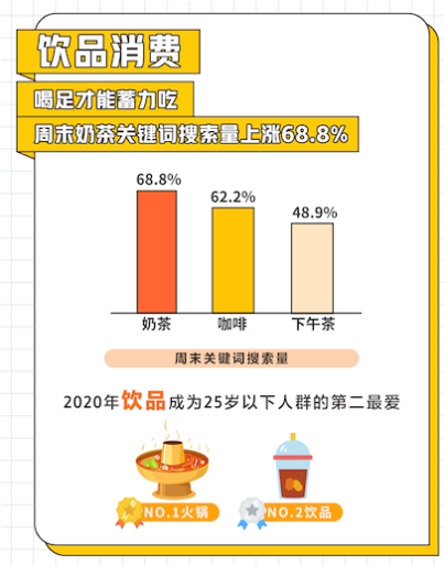 周末餐飲消費中,在美團點評,周末奶茶、咖啡關鍵詞搜索量上漲均超過60%,飲品更是成為25歲以下人群除火鍋之外的“心頭好”。