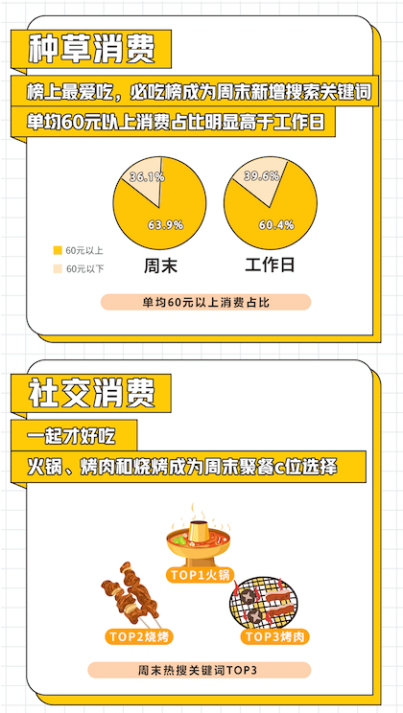 跟著榜單種草、拔草的“種草消費”成為周末消費的重要特點之一。美團6-7月數據顯示,“必吃榜”成為周末新增熱搜關鍵詞,且6-7月周末單均60元以上消費占比達63.9%,明顯高于工作日的60.4%。