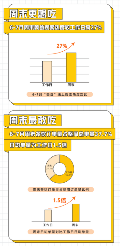 據美團點評餐飲學院發布的《2020周末餐飲堂食消費趨勢洞察》顯示,疫情恢復期,餐飲堂食消費活力回歸,周末餐飲消費對整個餐飲市場復蘇助力明顯。美團6-7月線上美食搜索熱度中,周末的搜索熱度較工作日高出27%;周末餐飲線上訂單量占整周總單量的37.7%,日均單量為工作日的1.5倍。周末餐飲消費拉動經濟復蘇,正在成為驅動消費的新引擎。