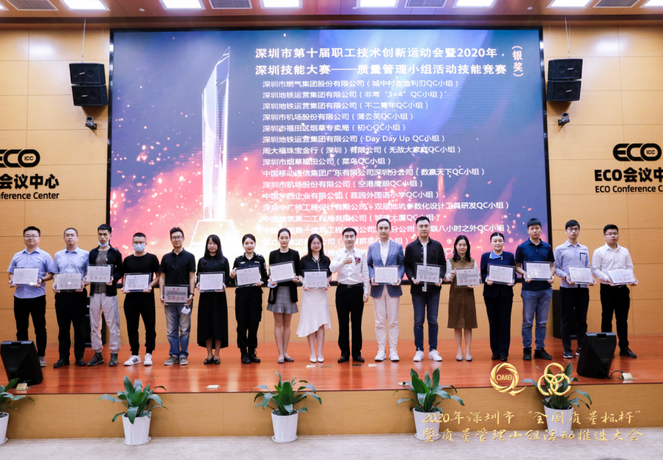 現場,獲得深圳市第十屆職工技術創新運動會暨2020年深圳技能大賽——質量管理小組活動技能競賽金獎的小組深圳市中興通訊股份有限公司低空飛行QC小組、中國華西企業有限公司冠澤金融中心QC小組為大家作了精彩發表展示。由市總工會基層組織建設和經濟工作部二級調研員張麗英宣讀“深圳市第十屆職工技術創新運動會暨2020年深圳技能大賽——質量管理小組活動技能競賽”結果的通報,并為16個金獎小組進行授牌,市政協常委、市質量協會執行會長李榕,市科協機關黨委副書記、紀委書記劉衛東,市婦聯組聯發展部二級調研員嚴俊勇,工商聯會員部部長劉傳分別為32個銀獎和32個銅獎小組進行授牌。