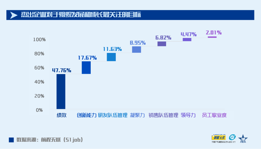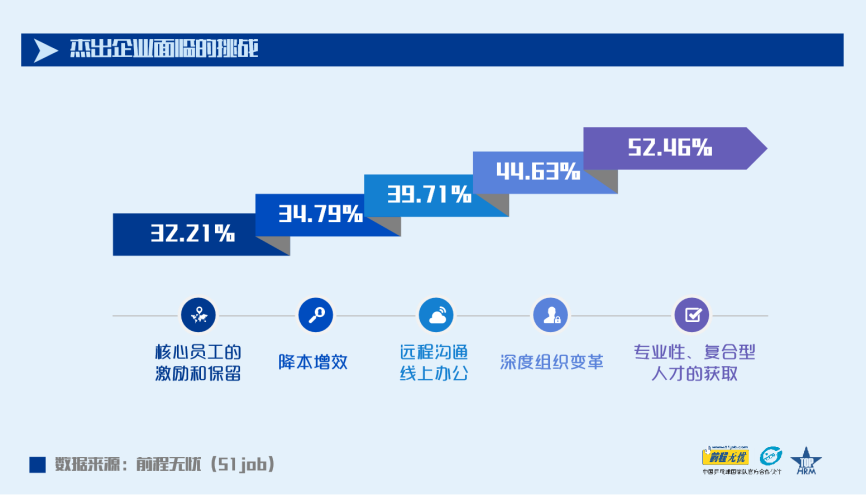 2020年杰出企業招聘員工總數較2019年增長了4.21%;55.48%的企業預計人均招聘成本呈增長趨勢,在此前提下,依然有56.04%的企業預計會在2021年擴大招聘來獲取人才優勢。894家獲獎企業中,有469家將“為籌備未來招募新團隊,加大專業性人才和復合型人才的獲取“列為本年度企業人力資源管理所面臨的最大的挑戰。