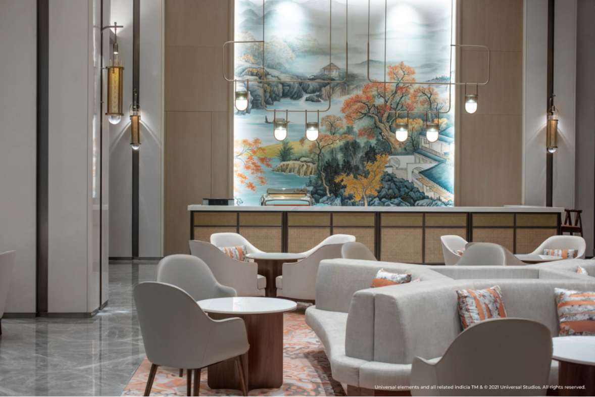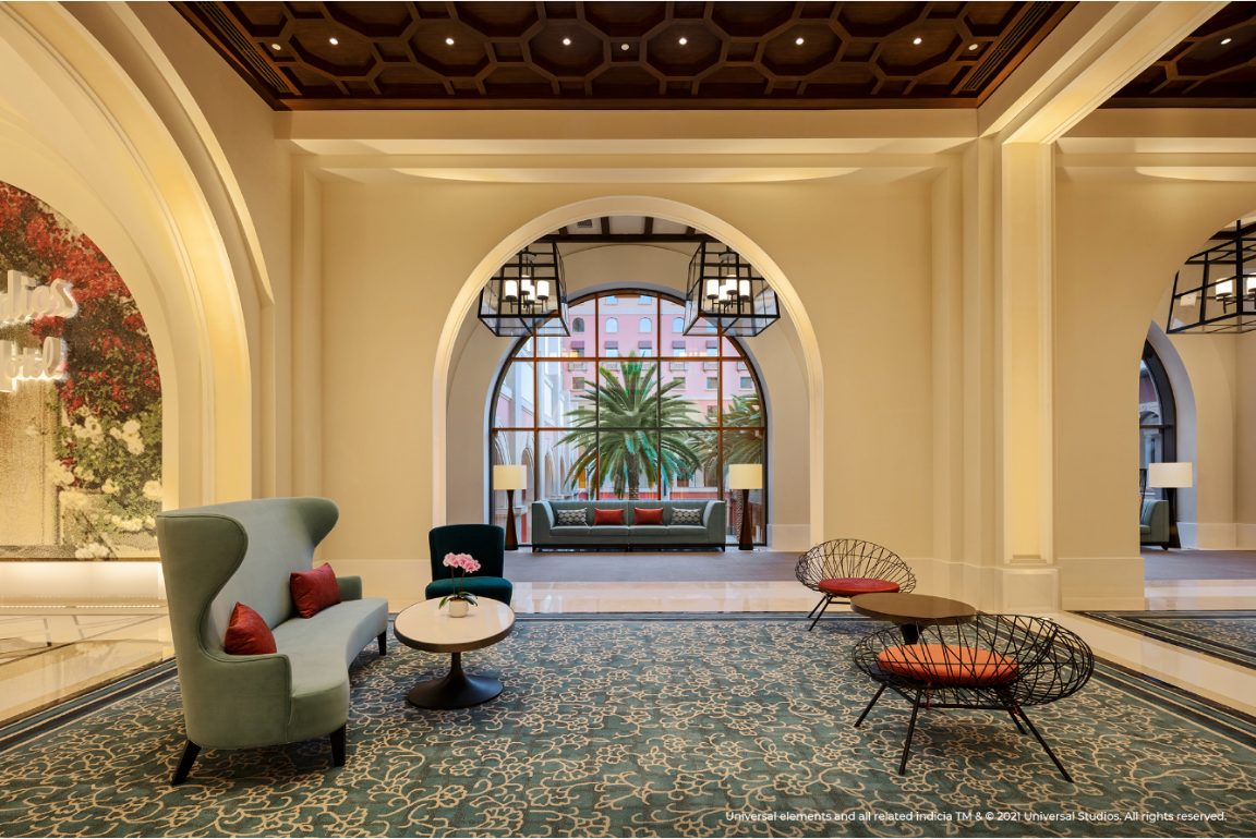 環(huán)球影城大酒店位于北京環(huán)球影城主題公園入口,入住賓客將可以俯瞰園區(qū)的絕佳景觀。作為全球首家以環(huán)球品牌命名的主題酒店,環(huán)球影城大酒店在設(shè)計中融入了極具加州特色的西班牙復興風格,巧妙再現(xiàn)好萊塢電影黃金時代的輝煌與風華,同時結(jié)合了中性色調(diào)的現(xiàn)代演繹以及繽紛色彩點綴。酒店大堂內(nèi)西班牙風格的噴泉和玻璃馬賽克三角梅花墻帶來輕快靈動的熱帶海岸氣息,定制的橙花調(diào)香氛則令人仿佛置身加州,讓賓客感受到典雅而充滿活力的度假氛圍。酒店公共區(qū)域內(nèi)的珍貴電影海報將帶領(lǐng)賓客探尋動人心扉的光影世界背后,精彩絕倫卻不為人知的創(chuàng)作瞬間。從復古經(jīng)典系列,到現(xiàn)代電影杰作,更有大量的幕后花絮呈現(xiàn)一段歷久彌新的電影之旅,回溯環(huán)球超過一個世紀的電影歷史的光輝歷程,致敬品牌在光影史上的耕耘與貢獻。