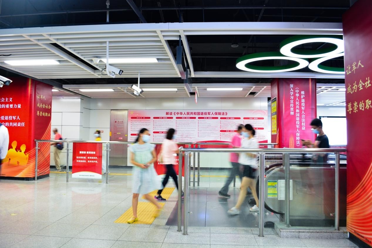 在地鐵石廈站,站廳包柱上的“維護退役軍人合法權益”、“讓軍人成為全社會尊崇的職業”等標語映入眼簾,為普法宣傳增添了濃厚氛圍。在安檢口處,還設立了解讀《中華人民共和國退役軍人保障法》墻貼,精心設計的公益宣傳吸引了很多市民駐足觀看。