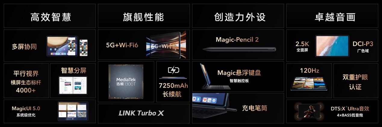 手機新品之外,榮耀全新旗艦平板榮耀平板V7 Pro也驚艷亮相。全球首發聯發科迅鯤1300T旗艦級平板定制芯片,采用11英寸2.5K護眼全面屏,支持120Hz高刷新率,搭載為平板進行深度優化的全新Magic UI5.0,平行視界適配4000+主流應用橫屏顯示。全新榮耀平板V7 Pro不僅擁有著出眾的配置,同時還具備四大旗艦產品力:高效的智慧化能力、旗艦性能與通訊能力、富有創造力的配件、卓越的音畫體驗,將重新定義安卓平板的旗艦標準。