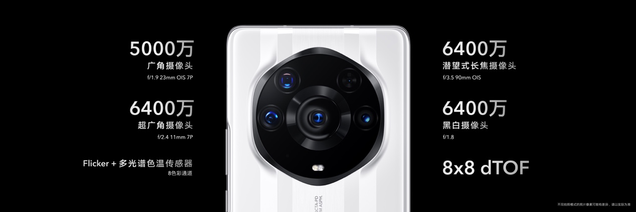 影像方面,榮耀Magic3至臻版打破手機鏡頭天花板,突破性地采用了多主攝設計。在與榮耀 Magic3 Pro采用同樣的業界領先6400萬潛望式長焦鏡頭和6400萬黑白鏡頭基礎上,榮耀 Magic3至臻版將5000萬像素超大底主攝升級為索尼 IMX700,傳感器尺寸達到1/1.28英寸,擁有業界領先的感光度(ISO),成像解析力、暗光拍攝能力更強。而超廣角微距鏡頭,也從1300萬像素,升級為業界領先的6400萬像素126°超大廣角微距鏡頭,能完美呈現廣闊空間中整個建筑、地標,亦能捕捉2.5cm近距離下的微小細節,提供肉眼無法看到的創意視角。多主攝計算攝影,實現多焦段高清影像。
