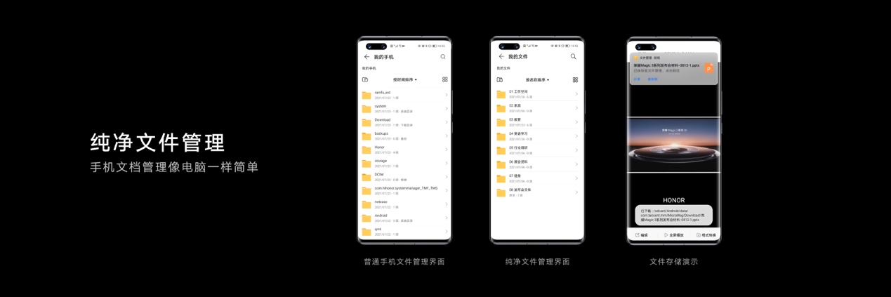 為了幫助事務繁多的商務人士更高效管理個人事務,榮耀還與各辦公平臺合作,讓用戶在釘釘、飛書、Welink、WPS辦公平臺的日程均能通過榮耀Magic3系列進行統一管理。而新增的純凈文件管理系統(此功能后續通過 OTA升級支持),則使榮耀Magic3系列在文件保存和管理方面進行進一步簡化,讓手機文件管理從此可以像電腦一樣簡單便捷。