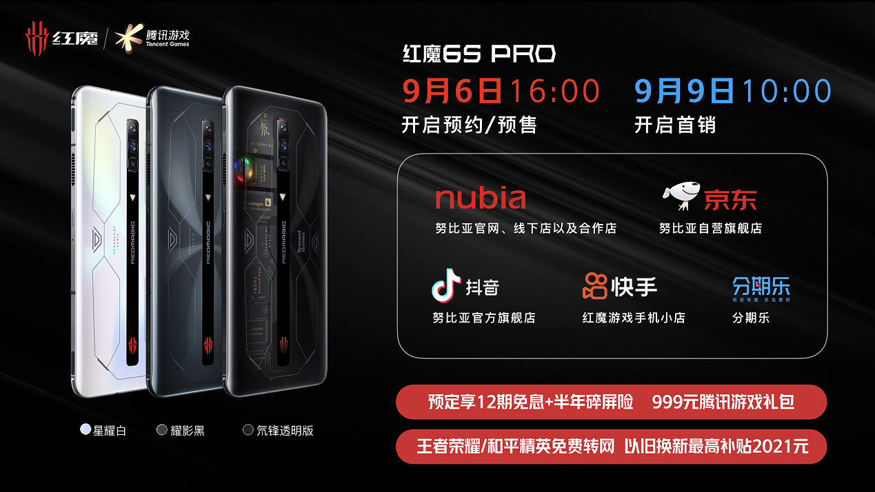 紅魔6S Pro目前已在努比亞官網(wǎng),努比亞京東自營旗艦店開啟預(yù)售,9月9日上午10點(diǎn)全國線上線下渠道同步開售!現(xiàn)在預(yù)定享12期免息并贈送半年碎屏險,購機(jī)尊享價值999元的騰訊游戲禮包、王者榮耀/和平精英免費(fèi)轉(zhuǎn)網(wǎng)資格,以舊換新最高補(bǔ)貼2021元。