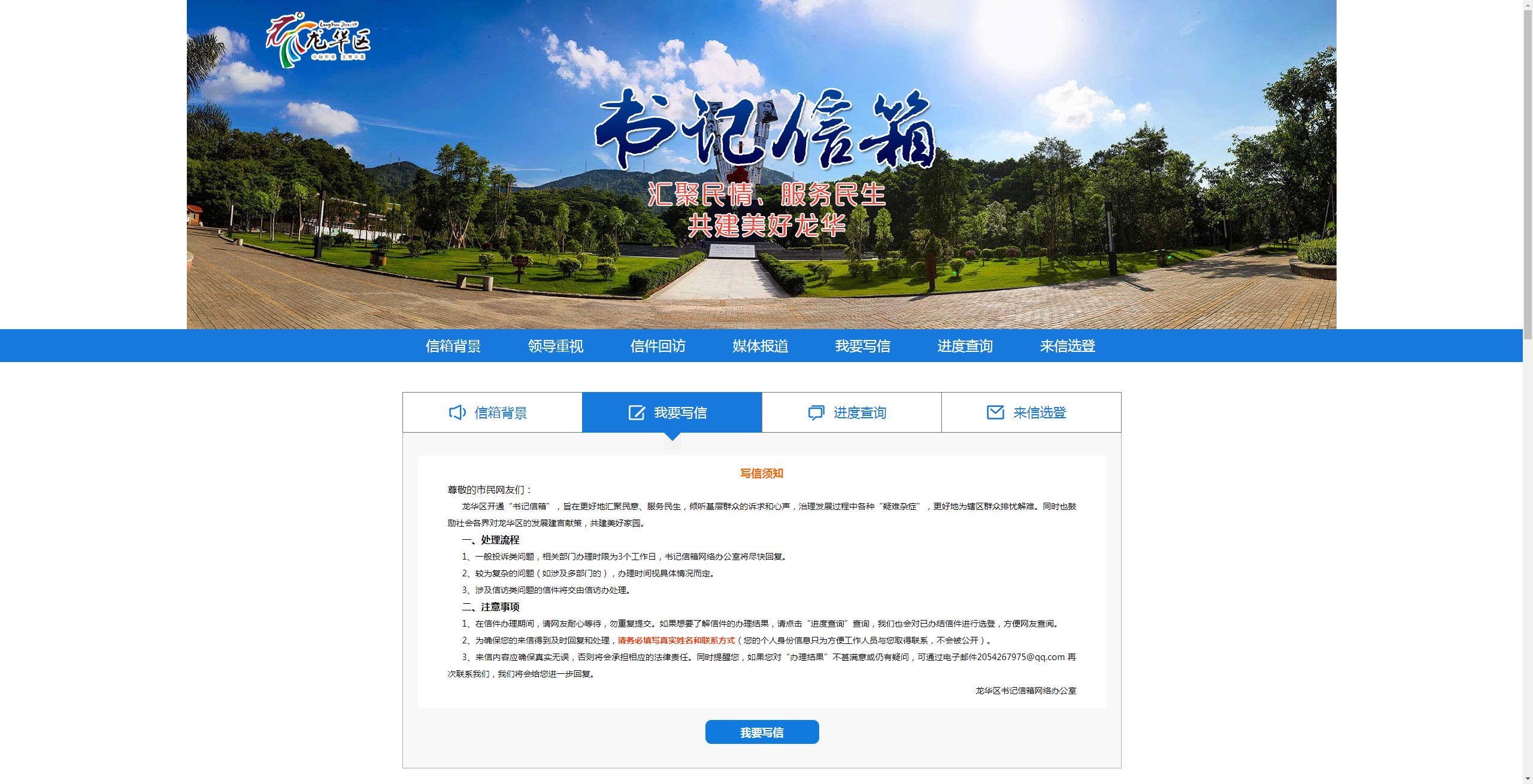 龍華區“書記信箱”網絡平臺是由龍華區領導的指導下搭建的網絡信息平臺,由深圳新聞網團隊進行開發搭建。“書記信箱”的構建,是龍華區委貫徹落實黨的群眾路線,踐行“三嚴三實”的一項新舉措?!皶浶畔洹弊?015年10月31日正式上線以來,逐步成為龍華市民向龍華區委反映、提出建議、意見和投訴請求的重要渠道。