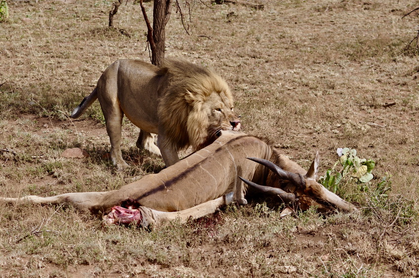作者運(yùn)氣不錯,在塞倫蓋蒂巡游時巧遇一頭雄獅守護(hù)在一頭被咬死的大羚羊旁。李仁奇 攝