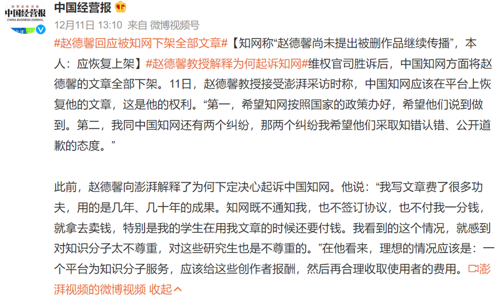 12月10日,中國知網向趙德鑫教授道歉,表示將妥當處理趙德鑫教授作品繼續在知網平臺傳播的問題。道歉中提到,2016年起,中國知網向全社會免費開放八年前出版的文獻,未來將進一步免費開放更多的學術資源。2019年起,所有在中國知網實名注冊的作者,可無限期免費使用自己的作品,管理自己的學術成果,并隨時跟蹤其研究成果的學術影響。