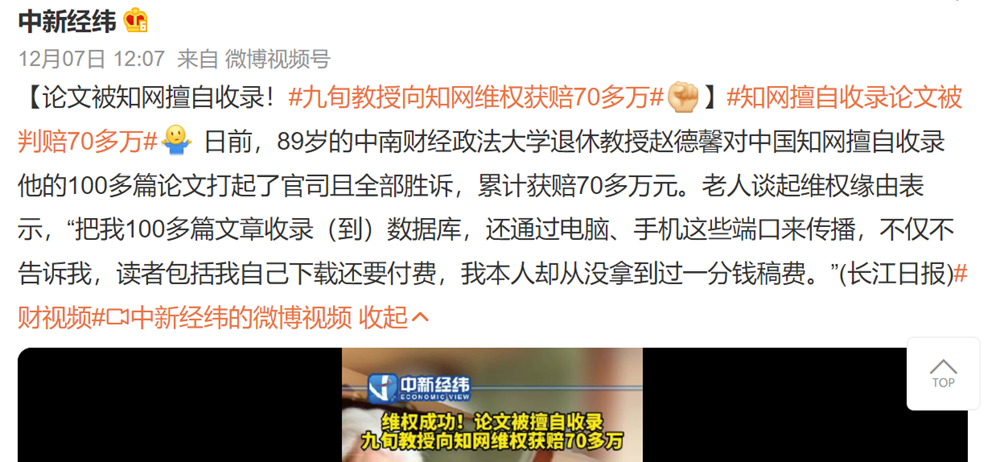 10.【法治事件】89歲退休法學教授趙德馨,從中國知網那里討回了自己160多篇稿件70多萬元元的收入,成為目前已知第一個向中國知網維權成功的勝訴案例。