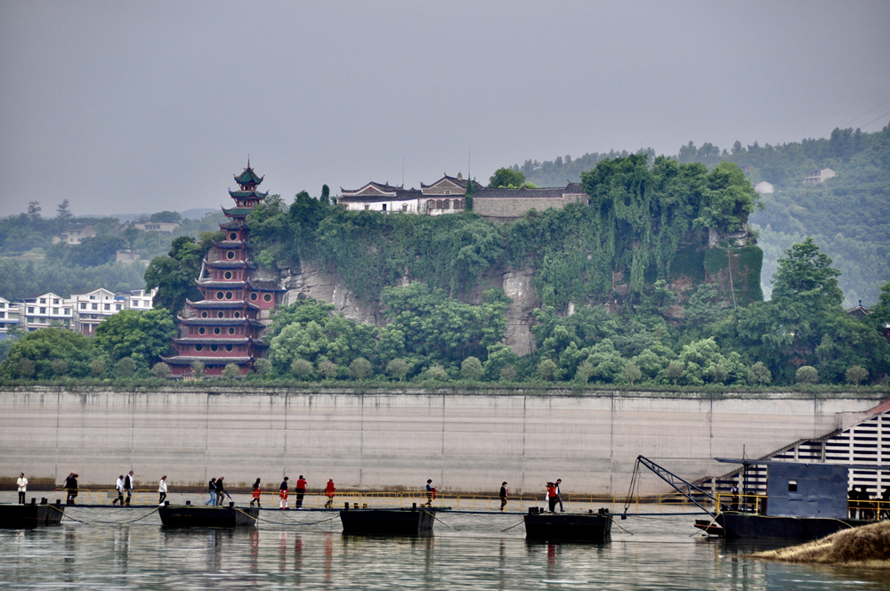 三峽庫區蓄水后,石寶寨被一道水泥圍堰保護起來,成為孤島,與江岸的聯系全憑一座吊橋,又被比喻為“世界最大的盆景”、“永不沉沒的航空母艦”。李仁奇 攝
