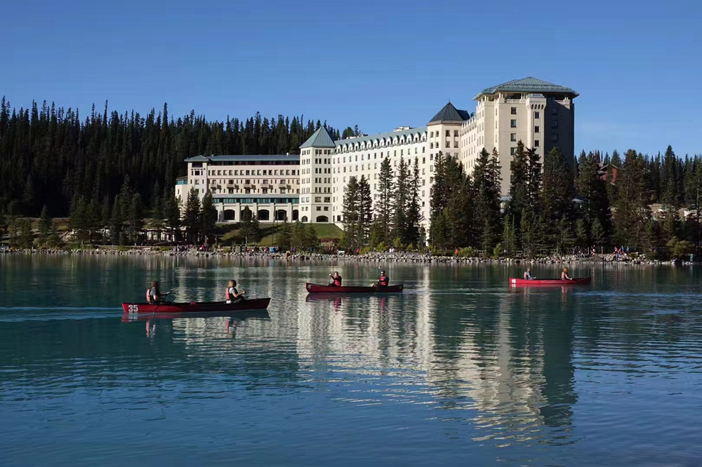 露易斯湖源自維多利亞冰川,湖水碧綠清澈,遠望就像鑲嵌在落基山脈中的一顆翡翠。李仁奇 攝