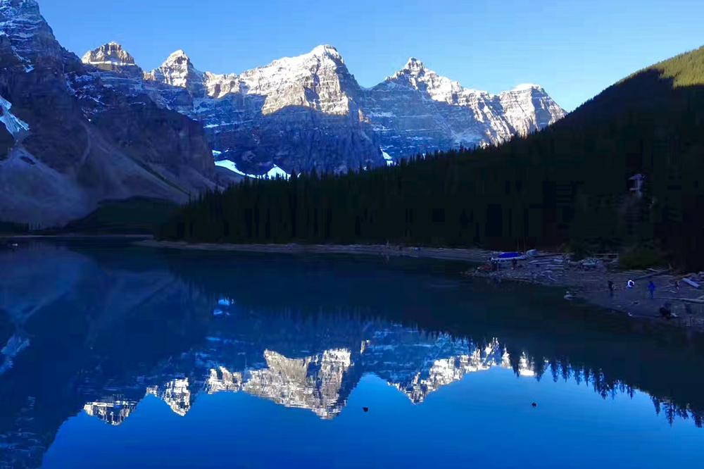 湖水晶瑩剔透,在鋸齒狀的山谷的擁環下,就像一塊寶玉。這塊“國寶”被印在加拿大20元的紙幣上。李仁奇 攝