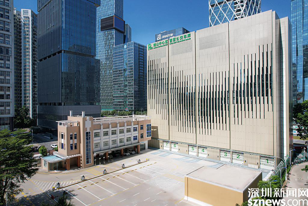 立體公交車庫位于南山區粵海街道文心五路的南山中心區公交場站內,原有31個地面車位,為12條公交線路提供服務。改造后的公交場站車庫變身為4組9層升降類立體公交車庫,建筑高度45.7米,設置有7個出入口,停車位增加到85個,其中地面充電車位17個、立體車庫內車位68個,并相應預留68個公交車充電接口。