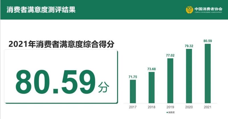 測評結果顯示,2021年度100個城市消費者滿意度綜合得分為80.59分,較2020年提高1.27分,且首次突破80分。