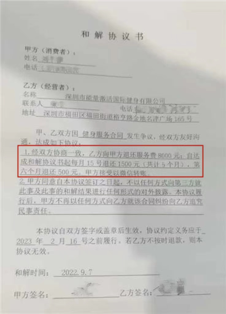 本人在該商家處購買健身會員卡服務,因健身服務合同內容與商家產生爭執,經協商,商家簽訂了退款協議,同意退還服務費8000元,分6期退還。在退還第一期費用1500元后,商家以經營困難為由拒不履行退款協議。