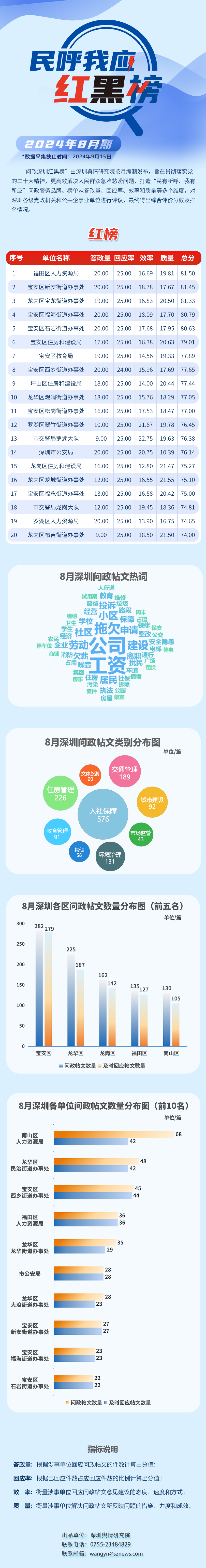 本期榜單采集的帖文主要來自深圳市及各區政府官網、深圳論壇、人民網領導留言板、深圳新聞網“民呼我應”等平臺,所采集帖文發布時間為2024年8月1日至8月31日,采集截止時間為2024年9月15日。